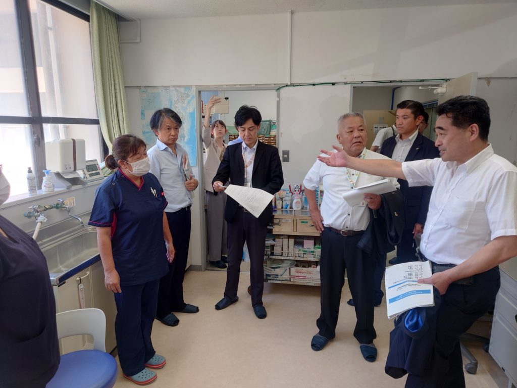 月に2回、医師が訪れる「へき地診療所」についての説明をする三島村の大山村長(さかい学の右隣り)。医師不在のため、必要に応じて診察室内にある大きなモニターを使った遠隔診療が行われている